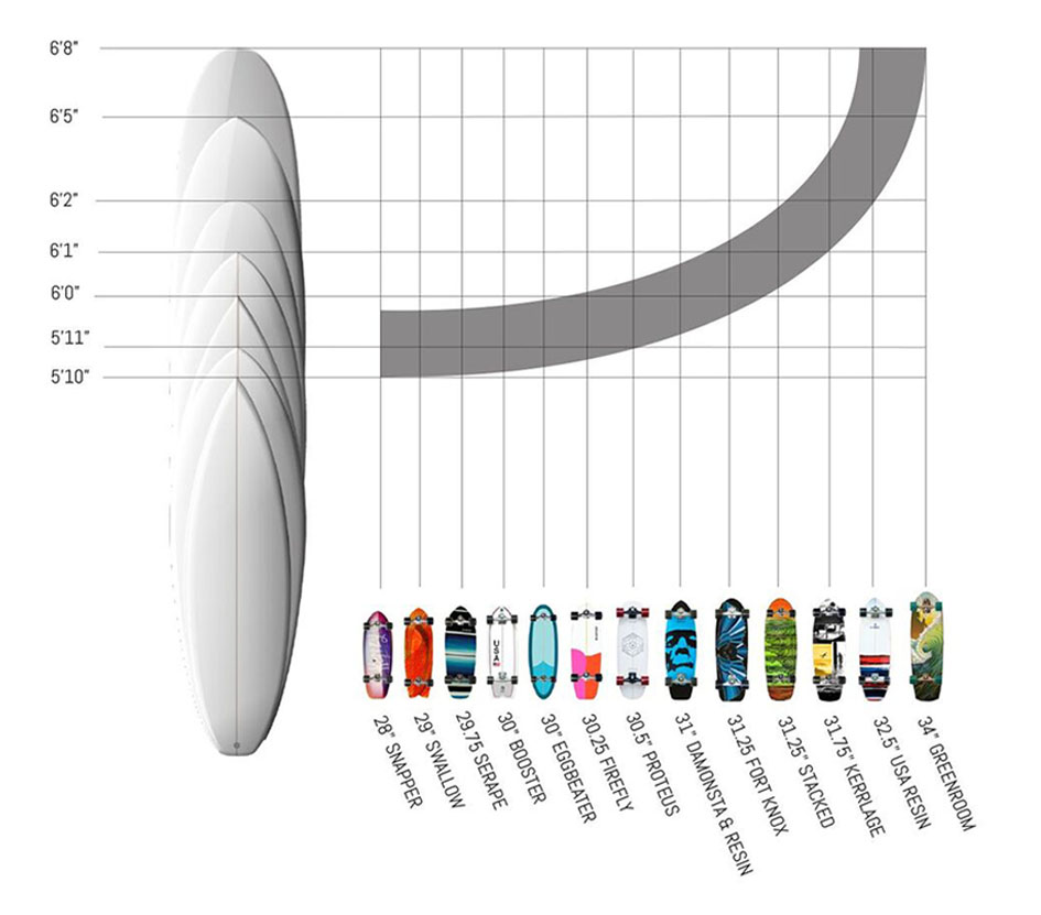 EQUIVALENCY RANGE | The trucks on each board model can be adjusted to feel tighter or looser, meaning it can feel equivalent to several different lengths of surfboard. A general rule is that shorter boards are tighter turning, while longer boards have a bigger arc of turn. That means you can also consider shape and graphics when choosing your favorite model. For example, a 31” Resin can feel like a 5-11 to a 6-2 surfboard depending on how you adjust the trucks.